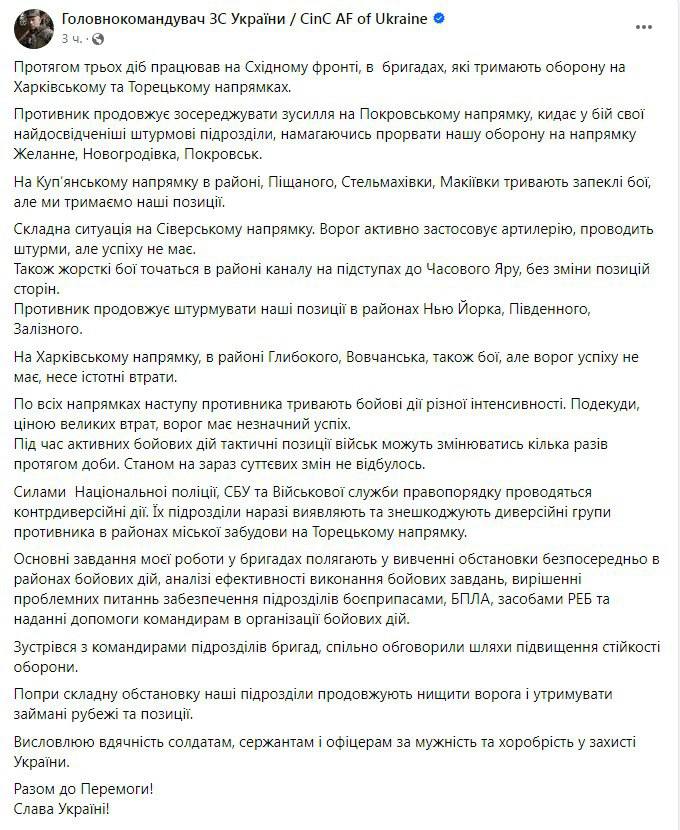 Тим часом згаданий нардепом головком ЗСУ Олександр Сирський у своїх соцмережах сьогодні визнав, що РФ "де-не-де" має "незначний успіх ціною великих втрат". Він підтвердив, що росіяни заходять у Торецьк, написавши: "Диверсійні групи противника виявляють та знешкоджують у районах міської забудови на Торецькому напрямку".
