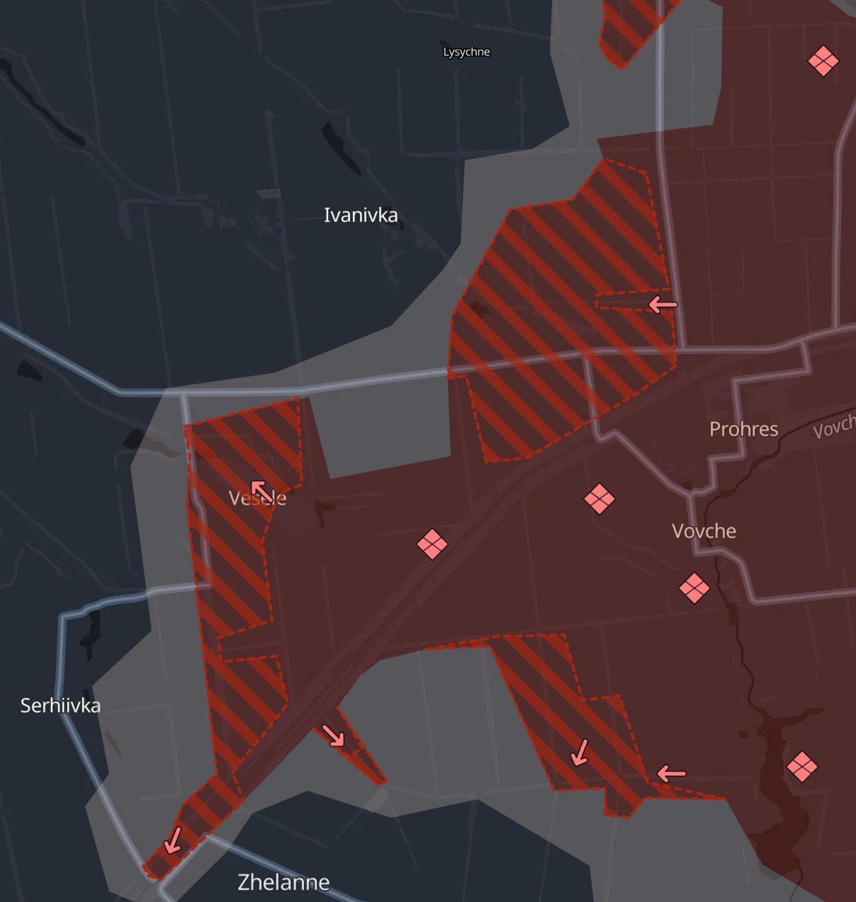 Також паблік заявляє, що росіяни просунулися біля Лісничого, Іванівки, Сергіївки та Бажаного. Тобто просування у бік Покровська (колишній Краноармійськ) та Мирнограда (колишній Димитрів) продовжуються щодня. Як видно по карті, російські війська йдуть уздовж залізниці, обходячи з півночі лінію оборони українських військ біля насланих пунктів Карлівка, Яснобродівка та Камишівка.