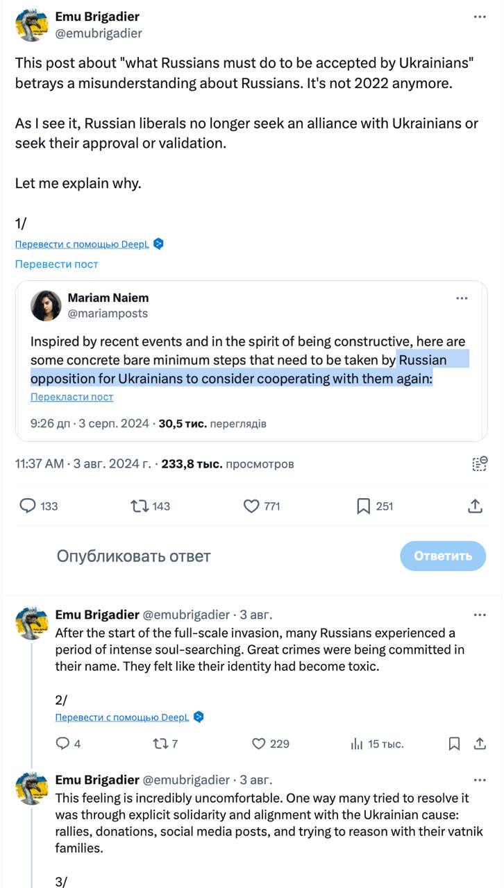 Водночас, австралійський блогер Emu Brigadier, який підтримує Україну, пише, що росіяни, які не підтримують війну, вже не прагнуть близькості з українцями. За його оцінкою, на початку війни вони намагалися публічно засуджувати війну та підтримувати Україну, але коли Зеленський закликав ЄС не пускати всіх росіян та вислати їх до Росії, а українські посли почали чинити для цього тиск, "російські ліберали розцінили це як зраду".