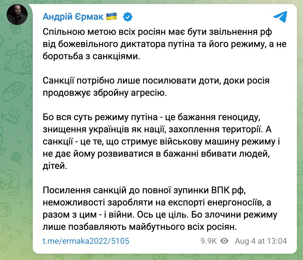 "Спільною метою всіх росіян має бути звільнення Росії від шаленого диктатора Путіна та його режиму, а не боротьба з санкціями. Санкції потрібно лише посилювати, доки Росія продовжує збройну агресію", - пише Єрмак.