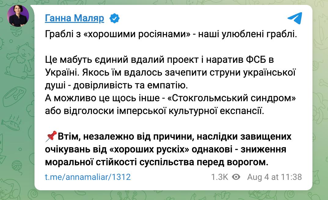 А екс-спікер Міноборони Ганна Маляр пише, що тема про "хороших росіян" - це "проект і наратив ФСБ", яким їм "удалося зачепити струни української душі - довірливість та емпатію", або "Стокгольмський синдром", або "відлуння імперської культурної експансії". Вона вважає, що ця тема призводить до "зниження моральної стійкості суспільства перед ворогом".
