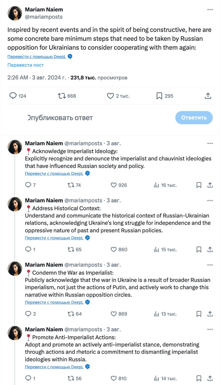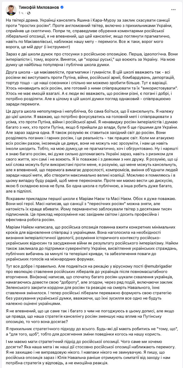 "Я не впевнений, що цей канселінг, якщо поглянути прагматично, наближає нашу мету - перемогу. Все ж таки ворог мого ворога - це мій друг (і інструмент). Я вважаю, що потрібно фокусуватися на головній меті і співпрацювати з усіма, хто проти Путіна, війни та російської армії. Я також розумію, як ставиться західний світ до росіян. Вони поділяють поганих і хороших росіян, і це реальність", - пише екс-міністр економіки України Тимофій Мілованов.