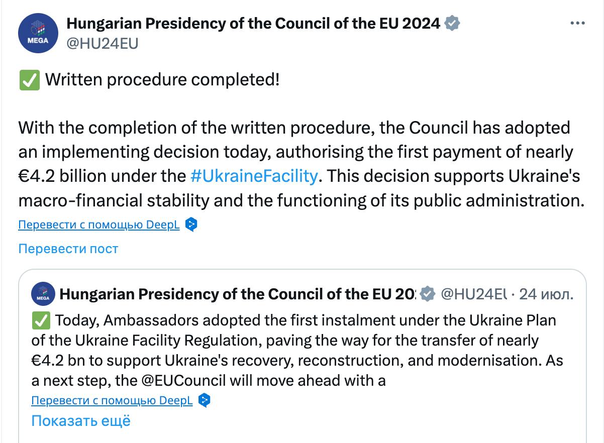 Рада ЄС затвердила виділення Україні першого траншу на 4,2 мільярди євро в рамках Ukraine Facility.