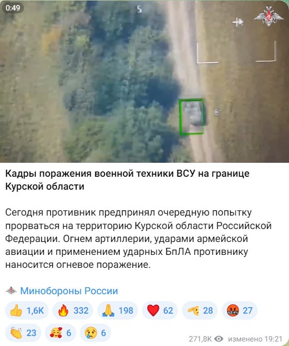 Міністерство оборони РФ видалило у своєму телеграм-каналі інформацію про те, що українські війська, що зайшли на територію Курської області , "витіснені на свою територію".