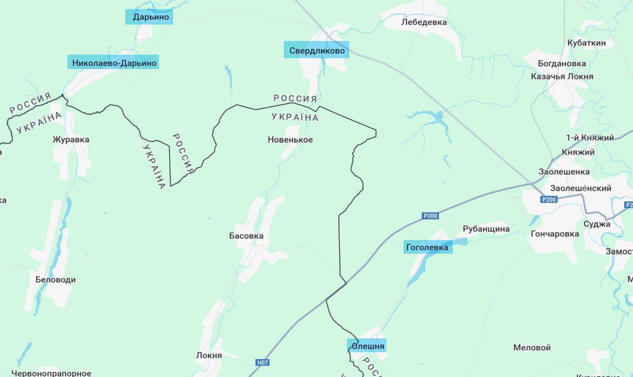 Російські військові паблики пишуть, що ЗСУ під час нічних атак закріпилися в районах прикордонних сіл Миколаєво-Дар'їно, Дар'їно, Свердликово, Гоголівка та Олешня (на карті). Максимальна глибина – в межах 4 кілометрів від кордону України.