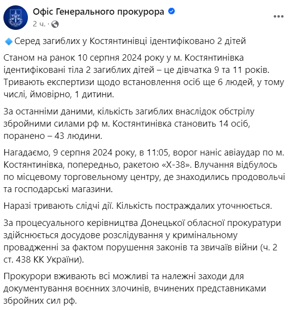 "Станом на ранок 10 серпня 2024 року в м. Костянтинівка ідентифіковано тіла 2 загиблих дітей – це дівчатка 9 та 11 років. Продовжуються експертизи щодо встановлення осіб ще 6 людей, у тому числі, ймовірно, 1 дитини", - йдеться у повідомленні.