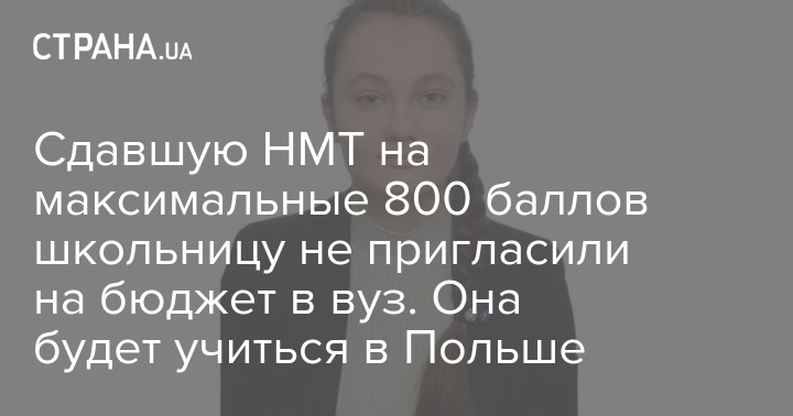 Ліцеїстка з Житомира Софія Тарнавська, яка набрала максимальні 800 балів на національному мультипредметному тесті (НМТ), не отримала жодної пропозиції від українських вишів на безкоштовне навчання та їде вчитися до Польщі.