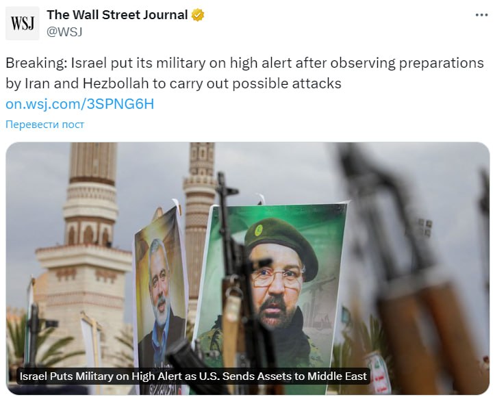 Нагадаємо, західні ЗМІ пишуть, що Іран атакує Ізраїль протягом 24 годин. Так, джерела в регіоні повідомили телеканалу Fox News про своє занепокоєння тим, що Іран та його довірені особи можуть атакувати Ізраїль протягом наступної доби у відповідь на вбивство політичного лідера ХАМАС Ісмаїла Ханії в Тегерані наприкінці минулого місяця.