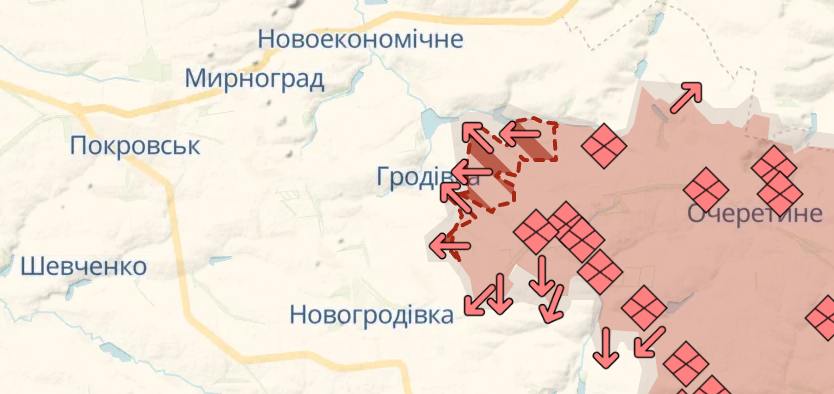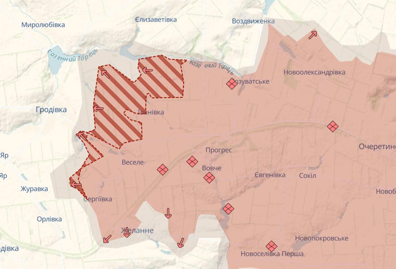 14.54 РФ суттєво просунулась на покровському напрямку, захопивши за добу одразу три села: Лисичне, Іванівку та Свиридоновку. А також просунувшись ще у низці населених пунктів, у тому числі в Гродівці.
