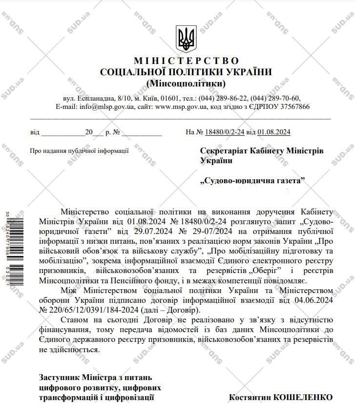 Однак, хоча договір між Мінсоцполітики та Міноборони підписано ще у червні, гроші на інтеграцію баз двох міністерств у держави немає, у зв'язку з чим багатодітні батьки та інші подібні категорії змушені особисто ходити до ТЦК, щоби продовжувати свою відстрочку.