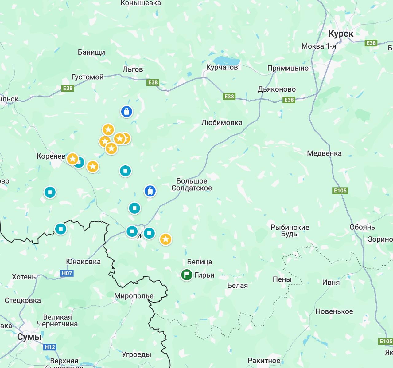 У сьогоднішньому зведенні РФ не згадується найпівнічніша точка присутності ЗСУ, яка згадувалася вчора - Левшинка (на карті синім). А також наближена точка в напрямку Великого Солдатського - Російське Порічне (друга синя позначка).