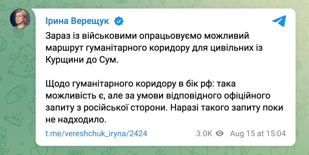"Щодо гуманітарного коридору у бік Росії: така можливість є, але за умови відповідного офіційного запиту з російської сторони. Поки що такого запиту поки не надходило", - пише вона.