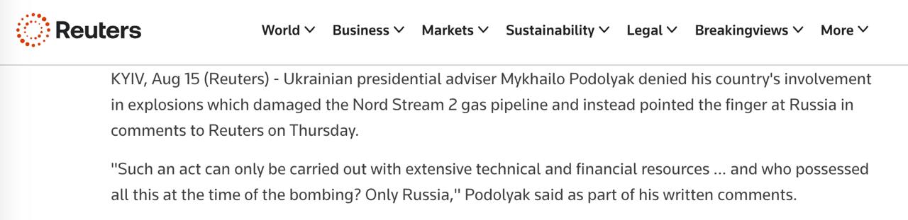 Радник глави Офісу президента Михайло Подоляк заперечує причетність України до підриву "Північних потоків" та заявляє, що це зробила Росія.