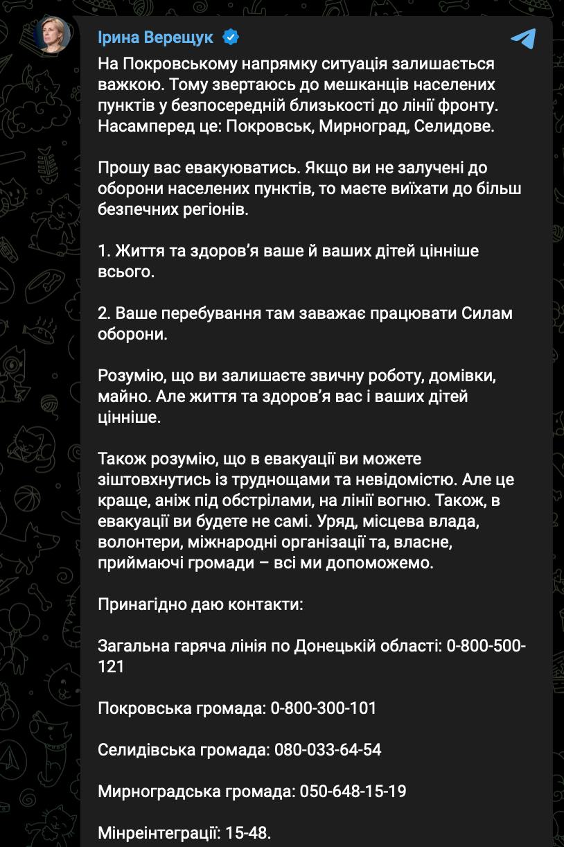 Тим часом віце-прем'єр Ірина Верещук заявила, що через погіршення ситуації на Покровському напрямку мешканцям Селидово, Покровська та Мирнограда потрібно виїжджати з міст.