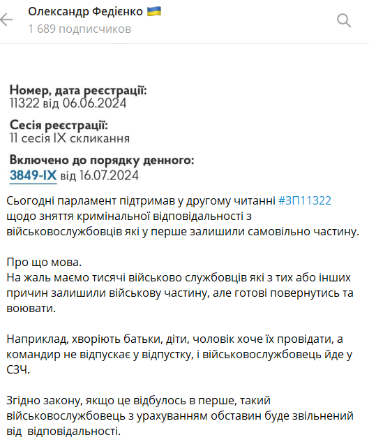 Нардеп заявив, що, згідно з ухваленим сьогодні законом, якщо СЗЧ сталося вперше, такого військовослужбовця з урахуванням обставин буде звільнено від відповідальності.