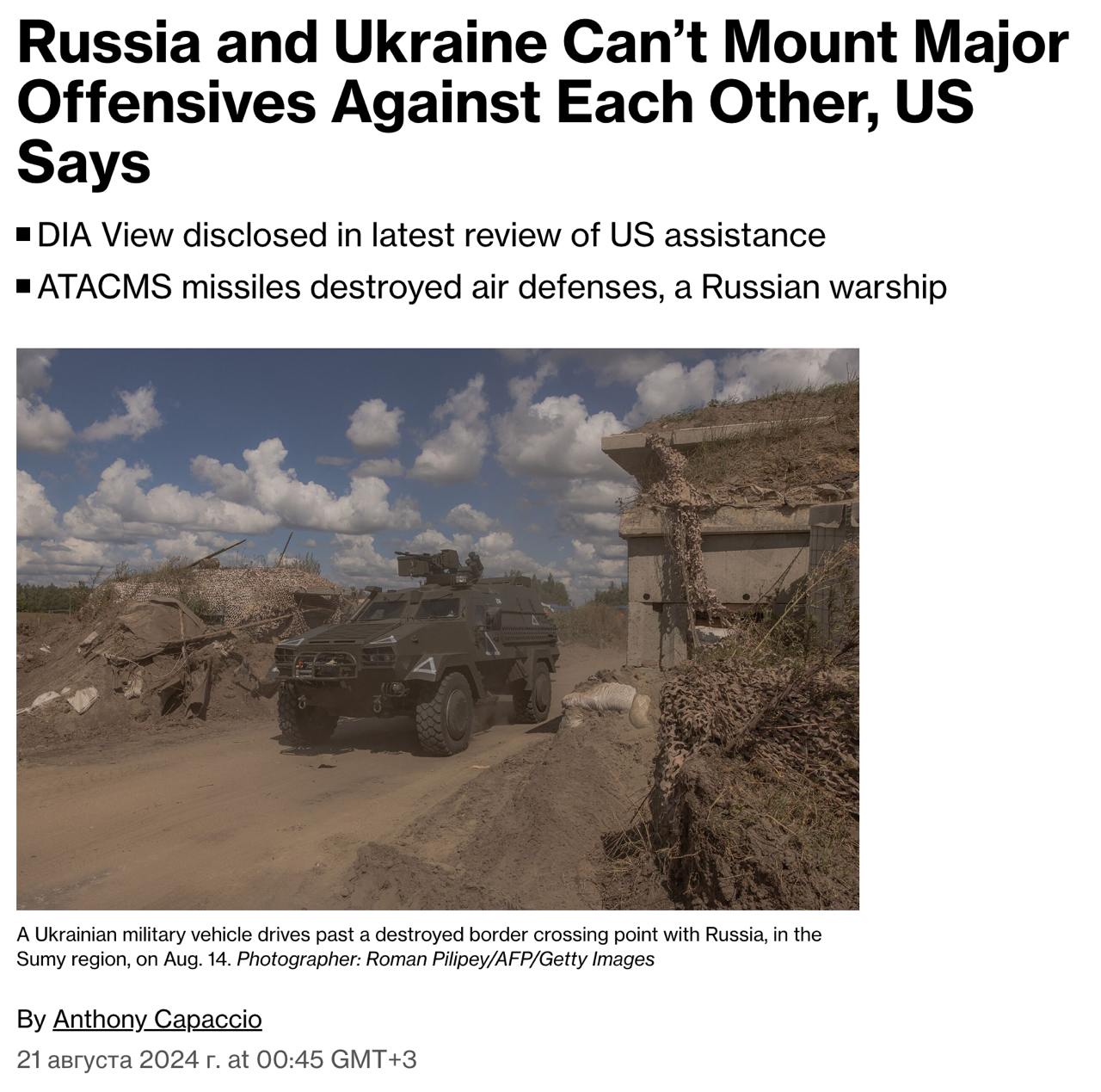 За даними Bloomberg, Агентство військової розвідки не бачить достатніх військових ресурсів ні України, ні Росії для проведення масштабних наступальних операцій.