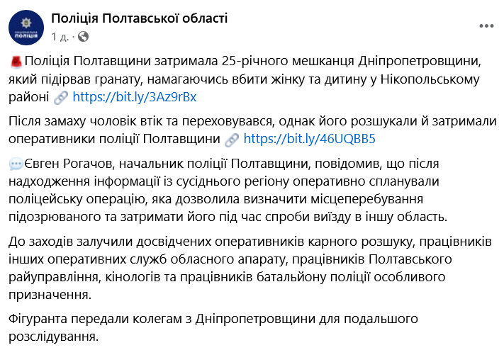 На Полтавщині спіймали чоловіка з Нікополя, який кинув гранату за дружину та дитину