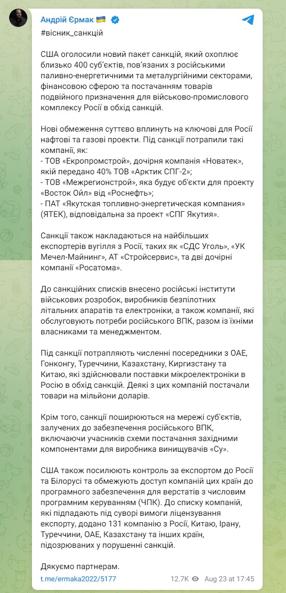 США оголосили новий пакет санкцій, що включає близько 400 суб'єктів із Росії та країн, які допомагають обходити санкції. Всі вони пов'язані з російськими паливно-енергетичними та металургійними секторами, фінансовою сферою та постачанням товарів подвійного призначення для військово-промислового комплексу Росії в обхід санкцій.