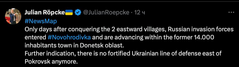 "Усього за кілька днів після захоплення двох сіл на сході російські війська увійшли до Новогродівки і просуваються територією колишнього міста з населенням 14 000 осіб у Донецькій області. Ще одна ознака того, що на схід від Покровська більше немає укріпленої української лінії оборони", - написав журналіст у Х.