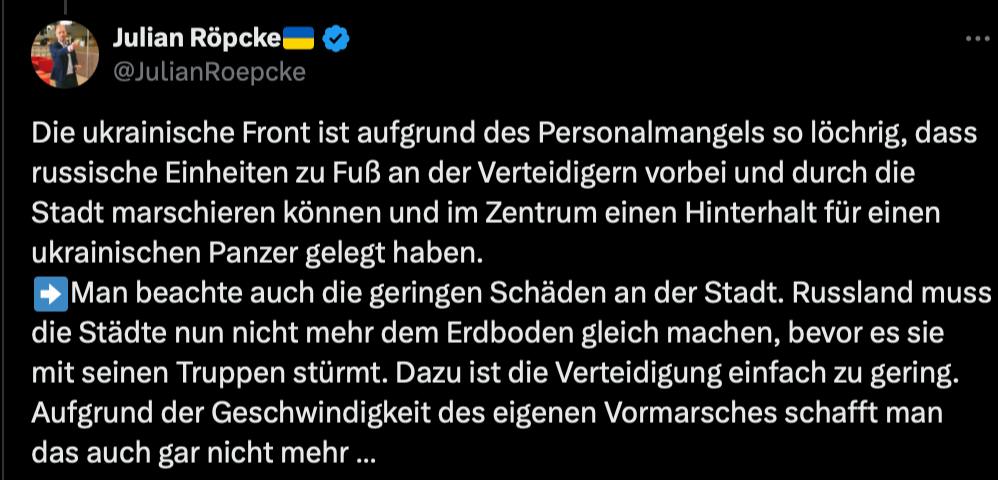 "Росії більше не потрібно зносити міста із землею, перш ніж штурмувати їх своїми військами. Захист просто занадто слабкий для цього. Через швидкість вашого власного просування ви більше не можете цього робити", - заявив Рєпке, наводячи приклад відео бою з українським танком у невстановленому населеному пункті.