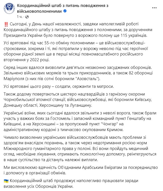 Сьогодні, 24 серпня, Україна та Росія провели обмін полоненими. 115 українських військових повернулися додому. Про це повідомив президент Володимир Зеленський.