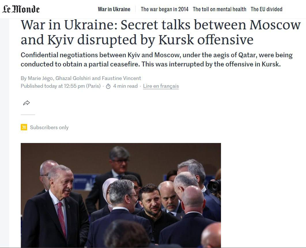 "Під егідою Катару велися конфіденційні переговори між Києвом та Москвою з метою добитися часткового припинення вогню, які були перервані наступом на Курській дузі", - йдеться у статті.