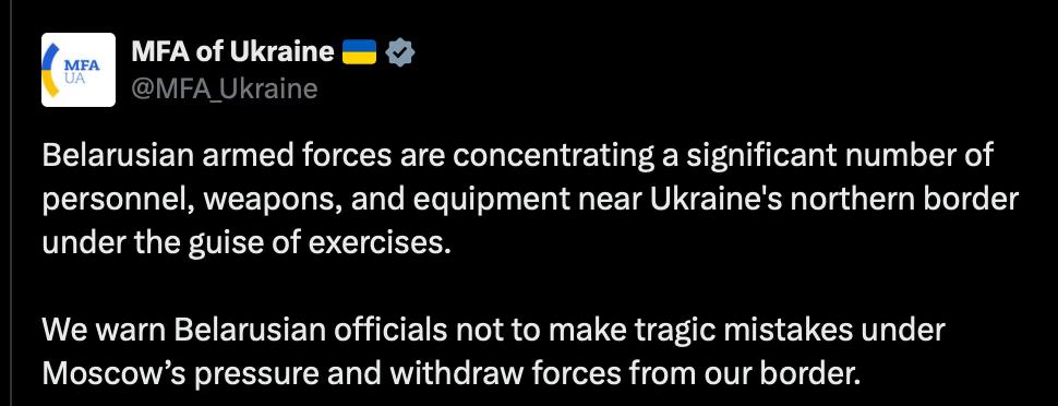 Міністерство закордонних справ України заявило про велику концентрацію білоруських військ біля кордону України і закликало їх відвести, щоб уникнути "трагічних помилок".