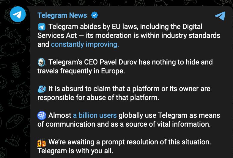 Також повідомляється, що Телеграм "дотримується законів ЄС, включаючи закон про цифрові послуги - його модерація відповідає галузевим стандартам і постійно вдосконалюється".
