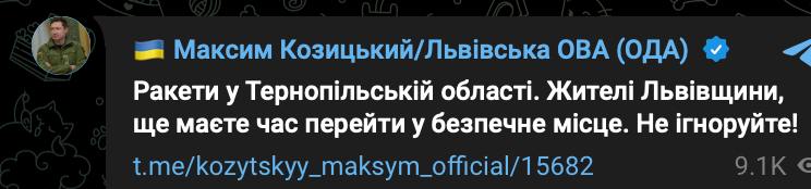 8.59 Ракети на Львівщині летять у напрямку Стрия, повідомив губернатор.