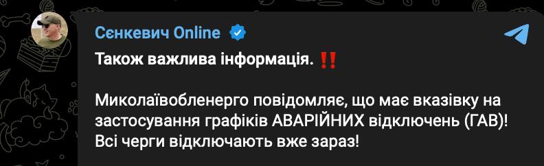 8.56 На Миколаївщині запроваджуються аварійні відключення світла, повідомив мер Миколаєва.