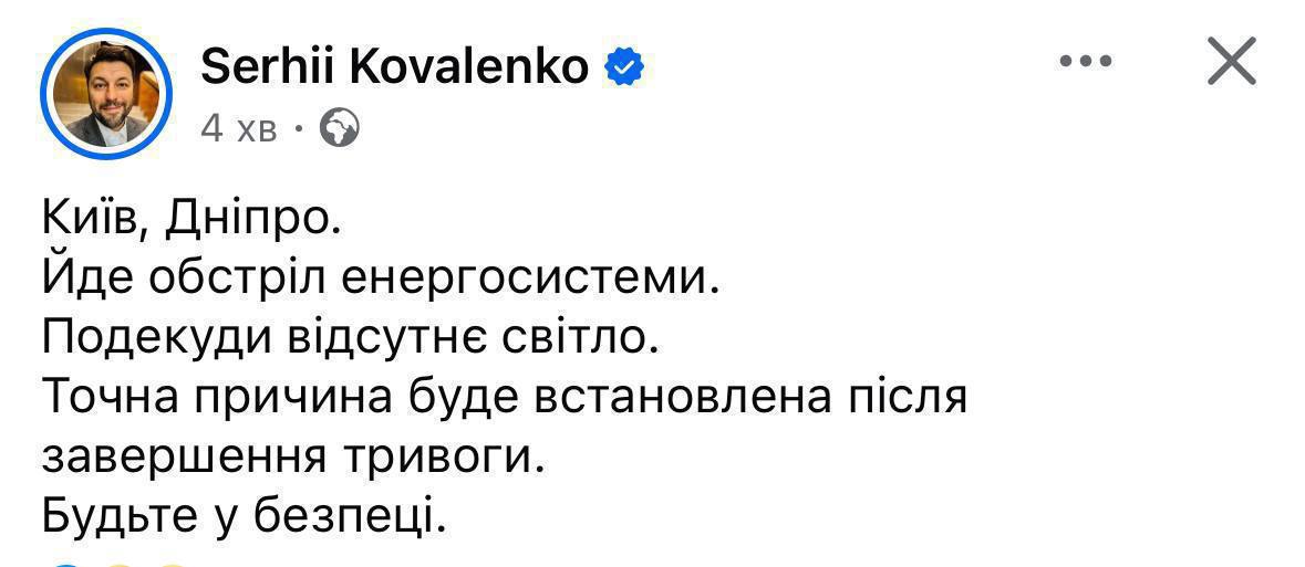 9:05 В енергетичній компанії Yasno підтвердили обстріл української енергосистеми.