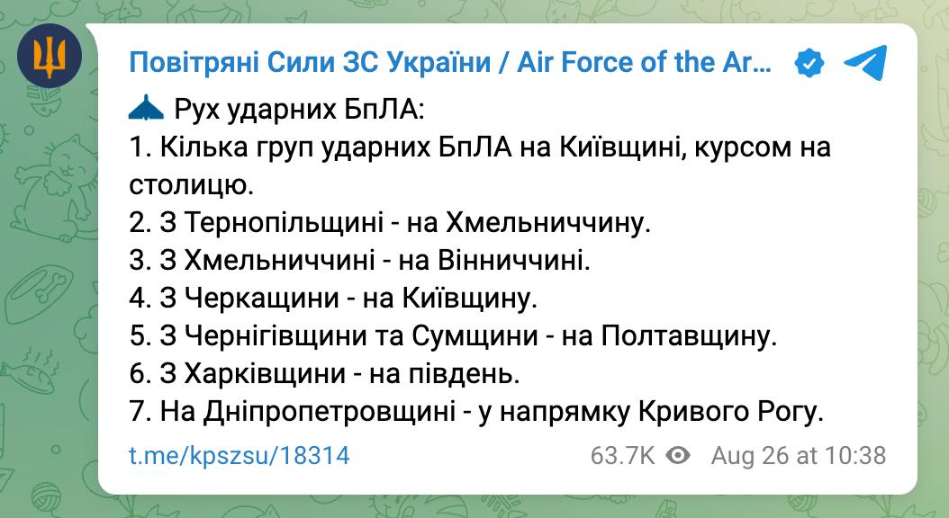У небі кілька десятків "Шахедів". Також Повітряні сили заявили про ракетну атаку з півдня, з боку Херсонської області, та на півночі з боку Сумської.