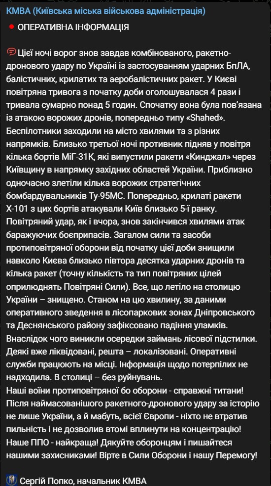 Близько четвертої ранку в Росії злетіли стратегічні бомбардувальники і здійснили пуски. Паралельно застосовувалася балістика.