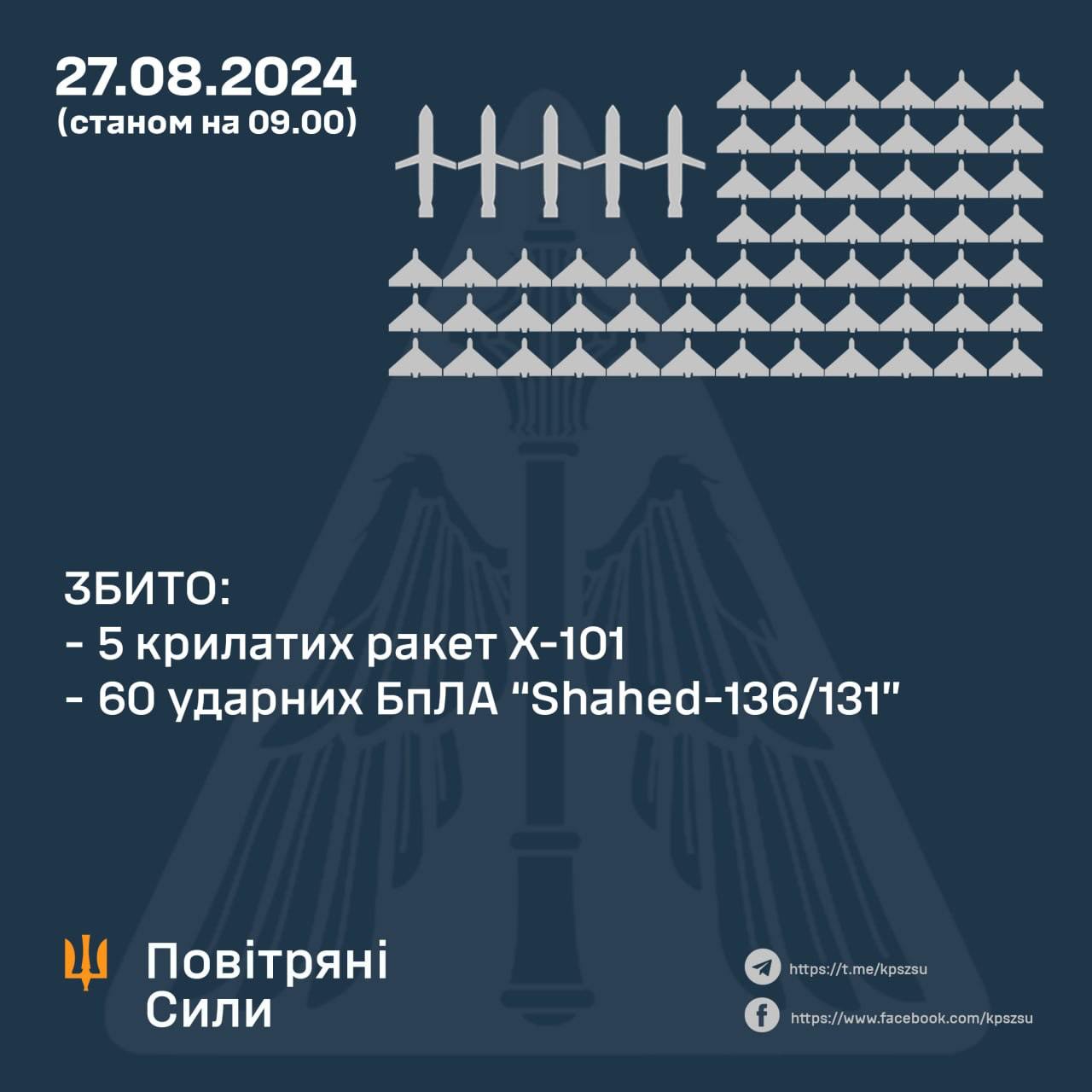 Під час сьогоднішньої масованої атаки РФ було знищено 5 крилатих ракет із 10-ти та 60 ударних безпілотників із 81-го. Про це повідомляють Повітряні сили ЗСУ.