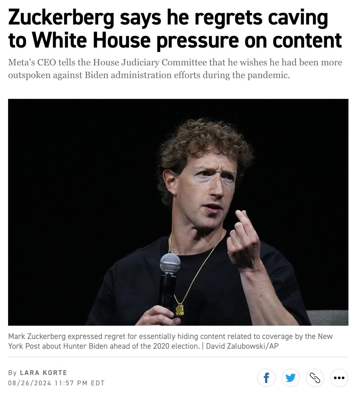 "З того часу стало ясно, що репортаж не був російською дезінформацією, і, оглядаючись назад, ми не повинні були знижувати рейтинг цієї історії", - пише глава Meta.