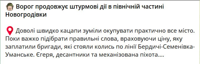 "Досить швидко вони зуміли окупувати практично все місто. Поки що важко підібрати правильні слова, враховуючи ціну, яку заплатили бригади, що стояли колись по лінії Бердичі-Семенівка-Уманське. Єгеря, десантники та механізована піхота", - пише канал.
