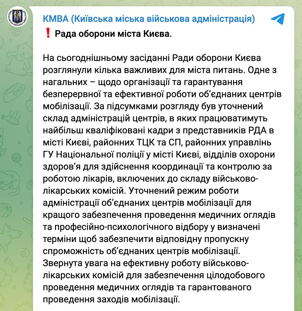 На сьогоднішньому засіданні Ради оборони Києва обговорили організацію "безперервної та ефективної" роботи об'єднаних центрів мобілізації.