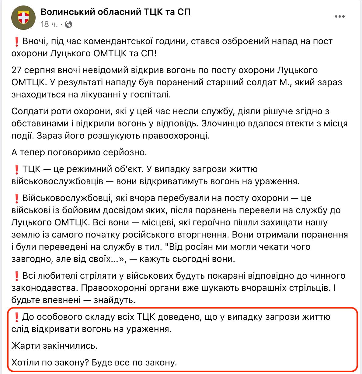 У прес-службі Волинського ТЦК повідомили, що під час комендантської години стався збройний напад на пост охорони Луцького ОМТЦК та СП. Поранено старшого солдата М., який зараз перебуває на лікуванні в госпіталі.