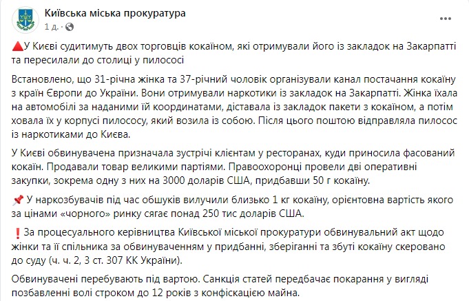 Обвинувальний акт щодо жінки та її спільника за статтями за придбання, зберігання та збут кокаїну направлено до суду. Обвинувачені перебувають під вартою. Санкція статей передбачає покарання у вигляді позбавлення волі на строк до 12 років із конфіскацією майна.