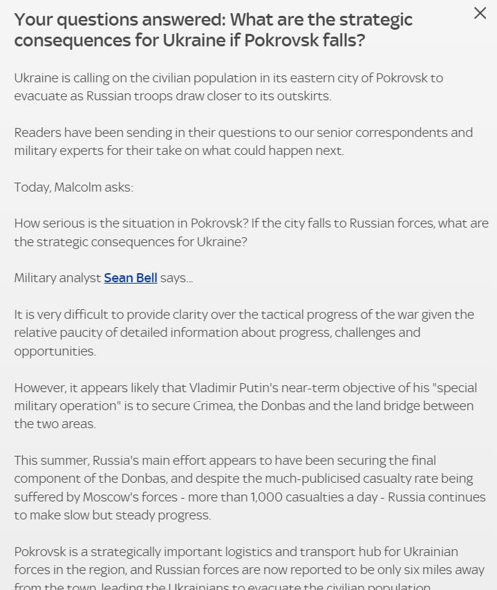 На думку аналітика Sky News, якщо росіяни захоплять Покровськ до зими, то, можливо, Путін дасть зрозуміти, що готовий до переговорів щодо припинення війни.