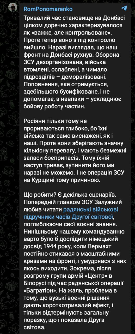 "Довгий час становище на Донбасі цілком доречно характеризувалося як важке, але контрольоване. Однак тепер воно з-під контролю вийшло. Поки виглядає, що наш фронт на Донбасі впав. Оборона ЗСУ дезорганізована, війська втомилися, ослаблені, а багато підрозділів деморалізовані. Поповнення, що отримується. здебільшого бусіфіковано, і не допомагає, а навпаки ускладнює бойову роботу частин., Зупинити його ми поки не можемо", - написав військовий.