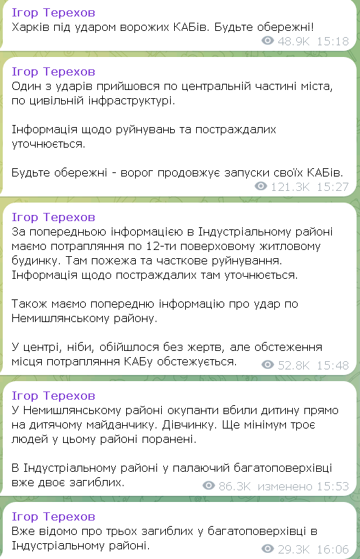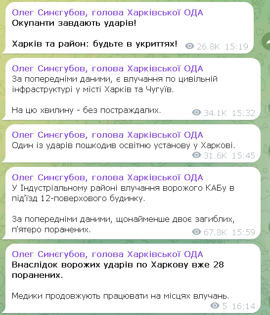 Про перші наслідки прильотів повідомляють мер Харкова Ігор Терехов та голова Харківської ОВА Олег Синегубов.