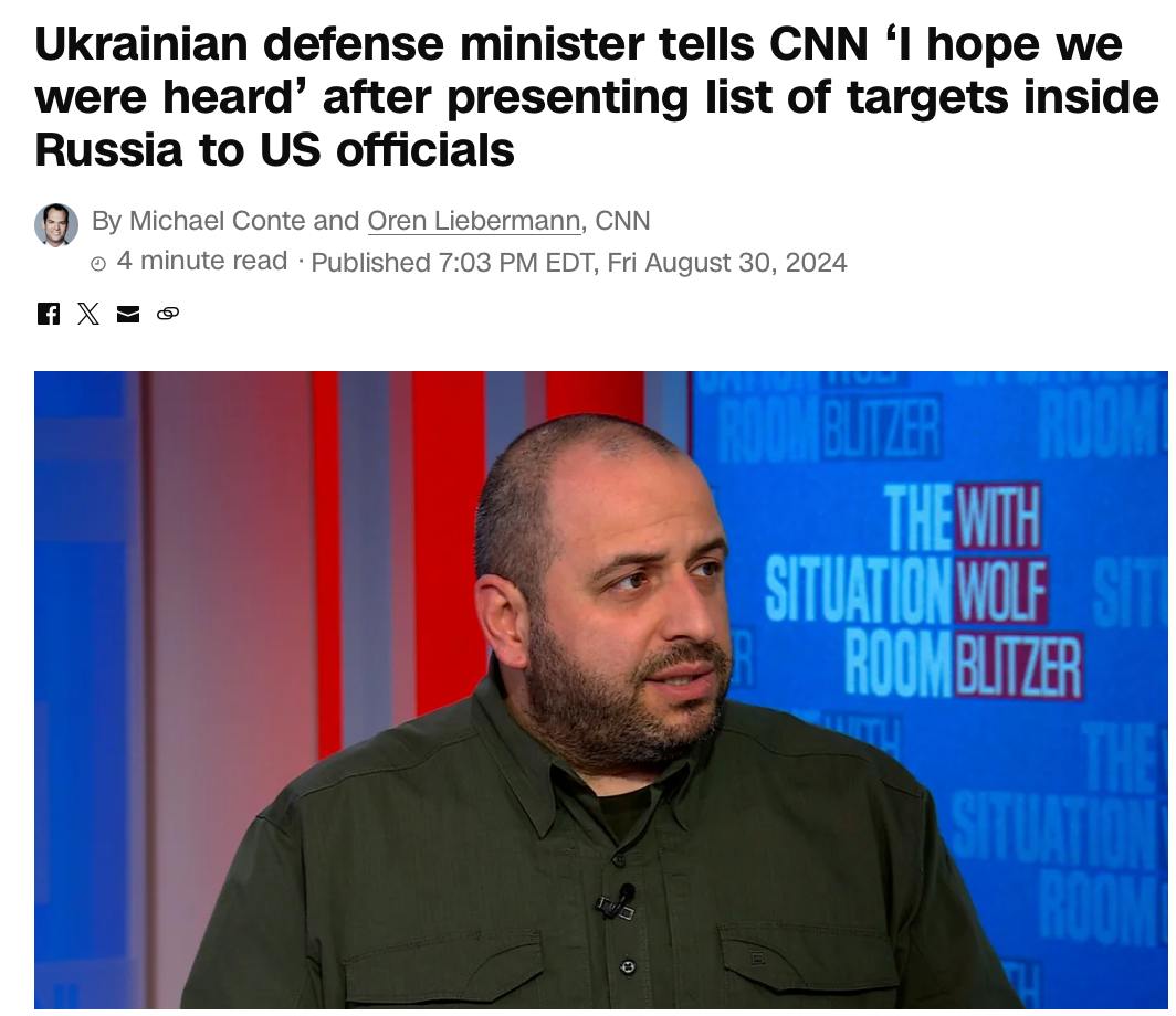 Як повідомляє телеканал, міністр оборони України Умеров, проте, вже передав адміністрації Байдена список цілей на території РФ, куди Київ пропонує завдати ударів - якщо США знімуть заборону на далекобійні удари по російській території американською зброєю.