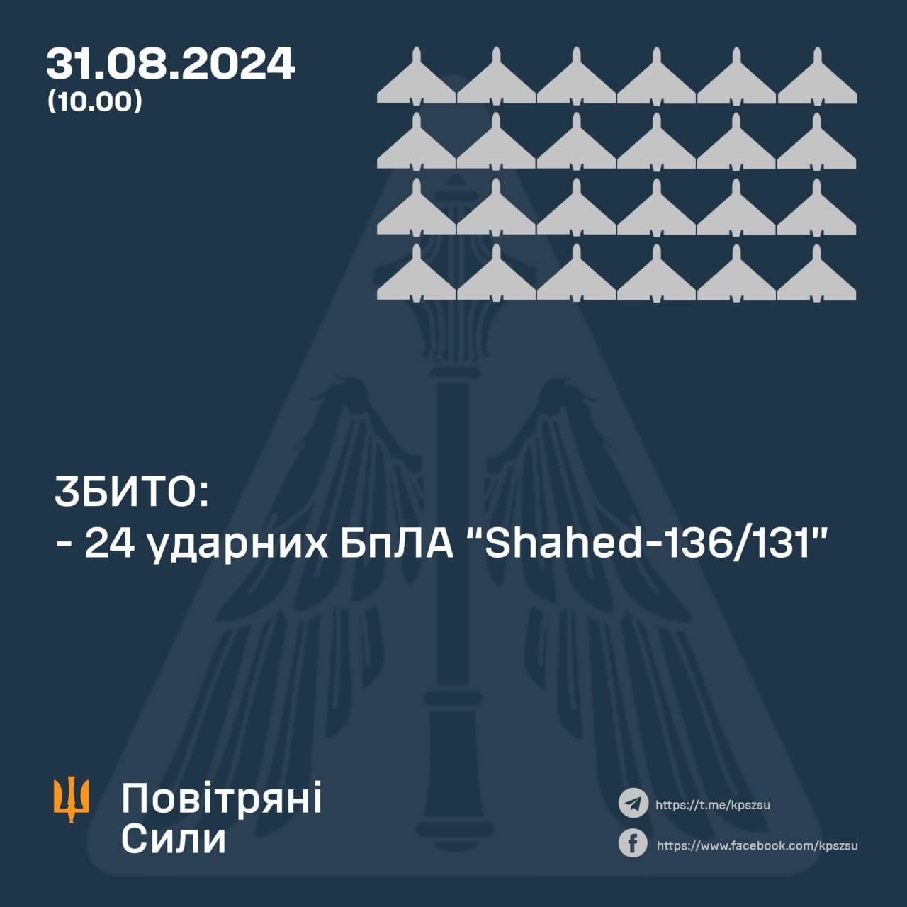 10:12 ЗСУ за ніч збили 24 з 52 російських "Шахедів".
