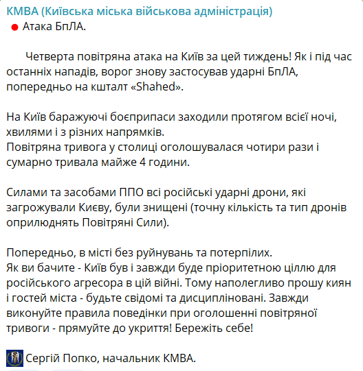Боєприпаси, що баражують, атакували столицю всю ніч, хвилями і за різними напрямками. Повітряна тривога у столиці оголошувалась чотири рази і тривала майже 4 години.