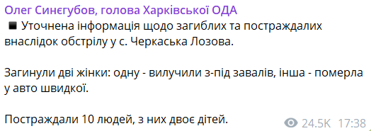 Про це повідомляє голова Харківської обласної військової адміністрації Олег Синегубов у своєму телеграм-каналі.