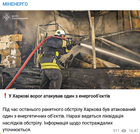 17:03 Під час сьогоднішнього ракетного удару по Харкову було атаковано один із енергетичних об'єктів, повідомляє Міненерго.