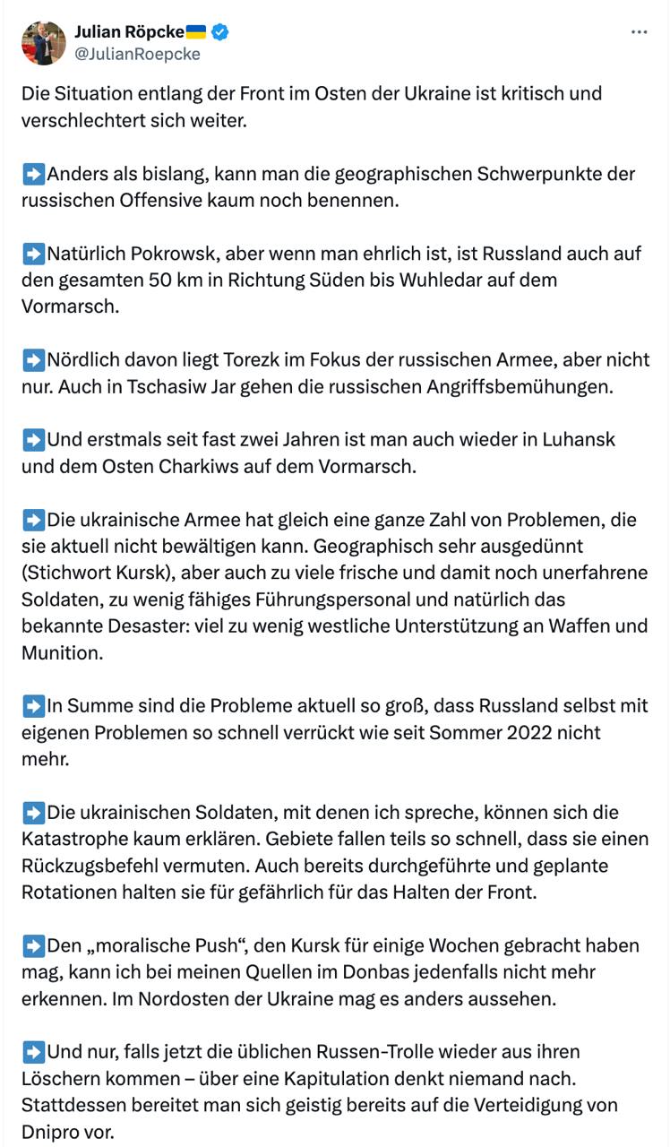 "Українські солдати, з якими я розмовляю, ледве можуть зрозуміти катастрофу, що відбувається. Території іноді втрачаються настільки швидко, начебто було віддано наказ на відступ. Вже проведені та заплановані ротації вони також вважають небезпечними для утримання фронту", - написав Рьопке.