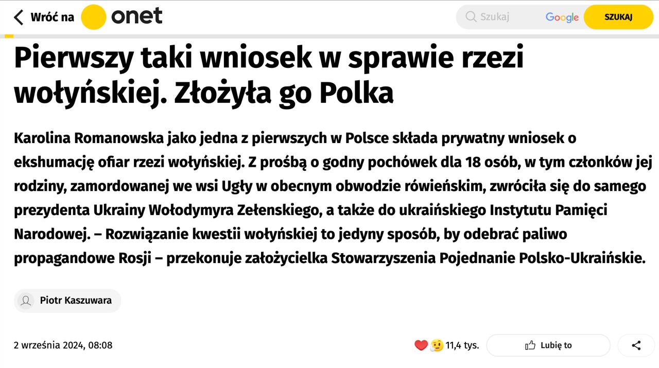Автором запиту виступила полька Кароліна Романовська, яка просить Володимира Зеленського та український Інститут національної пам'яті гідно перепоховати 18 осіб, зокрема членів її родини, убитих у селі Угли Рівненської області.
