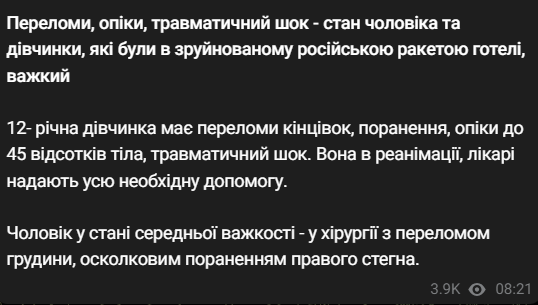 Дівчинка має переломи кінцівок, поранення, опіки до 45 відсотків тіла, травматичний шок. Вона перебуває у реанімації.